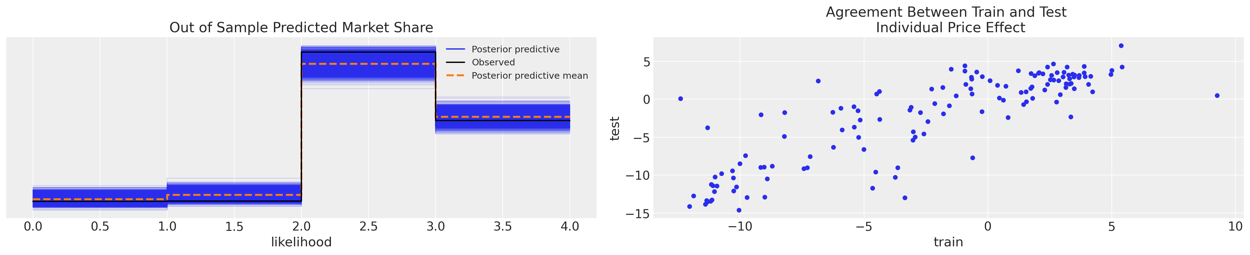But the real test is whether we can use what we learned about the preference ordering from the consumer’s first five observed choices to predict the market share determined by their subsequent choices. To do this we take our trained model and update the data with the test inputs. We then sample the posterior predictive distribution and evaluate the accuracy of the forecast market share using a posterior predictive check.