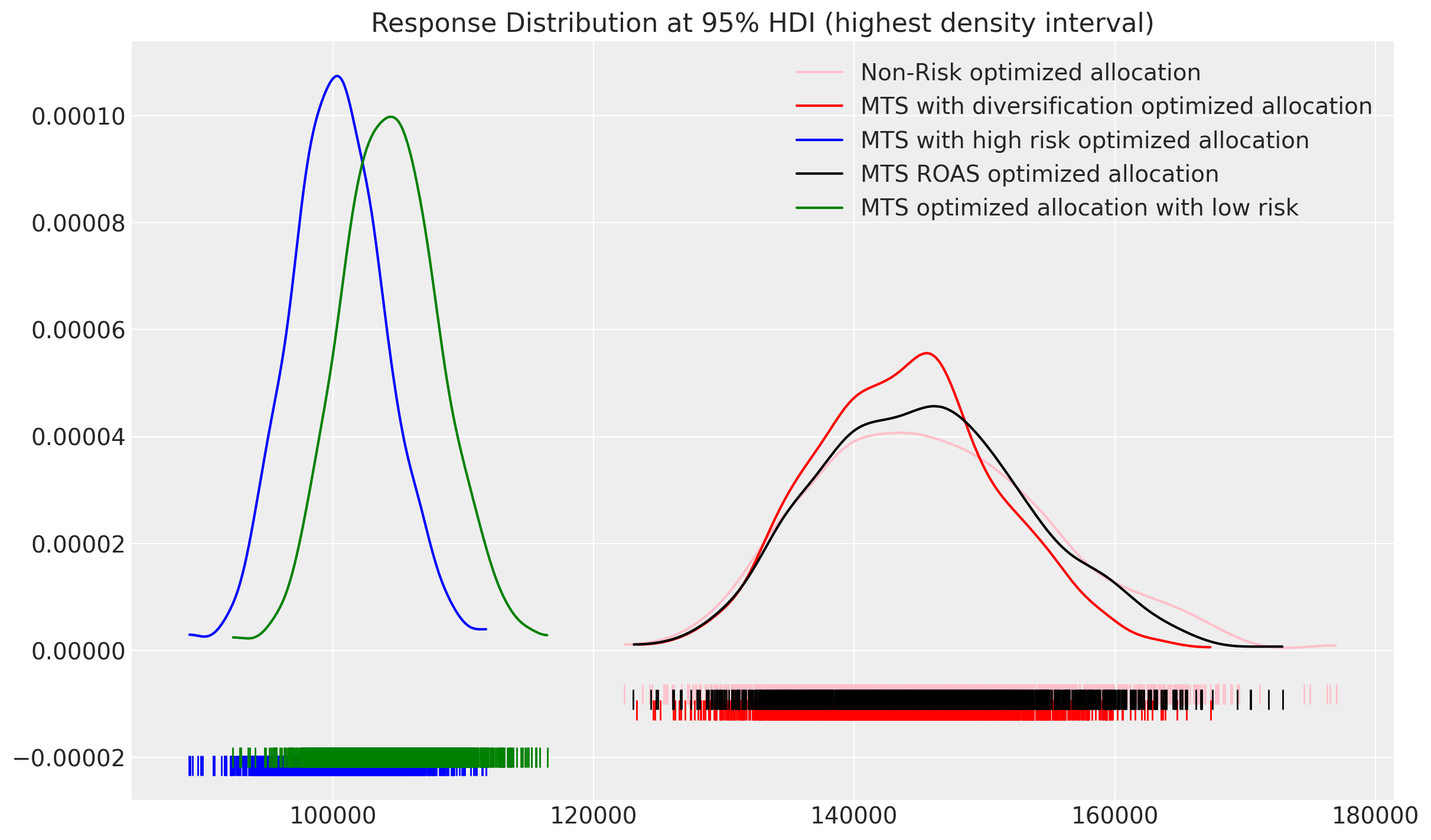 The optimizer is once again allocating the budget to \(X1\) majority, nevertheless \(X2\) it’s getting more money this time. However, this decision is informed by the expectation that the current combination will yield a higher Return on Advertising Spend (ROAS), while also presenting a small lower risk profile compared to the previous allocation.