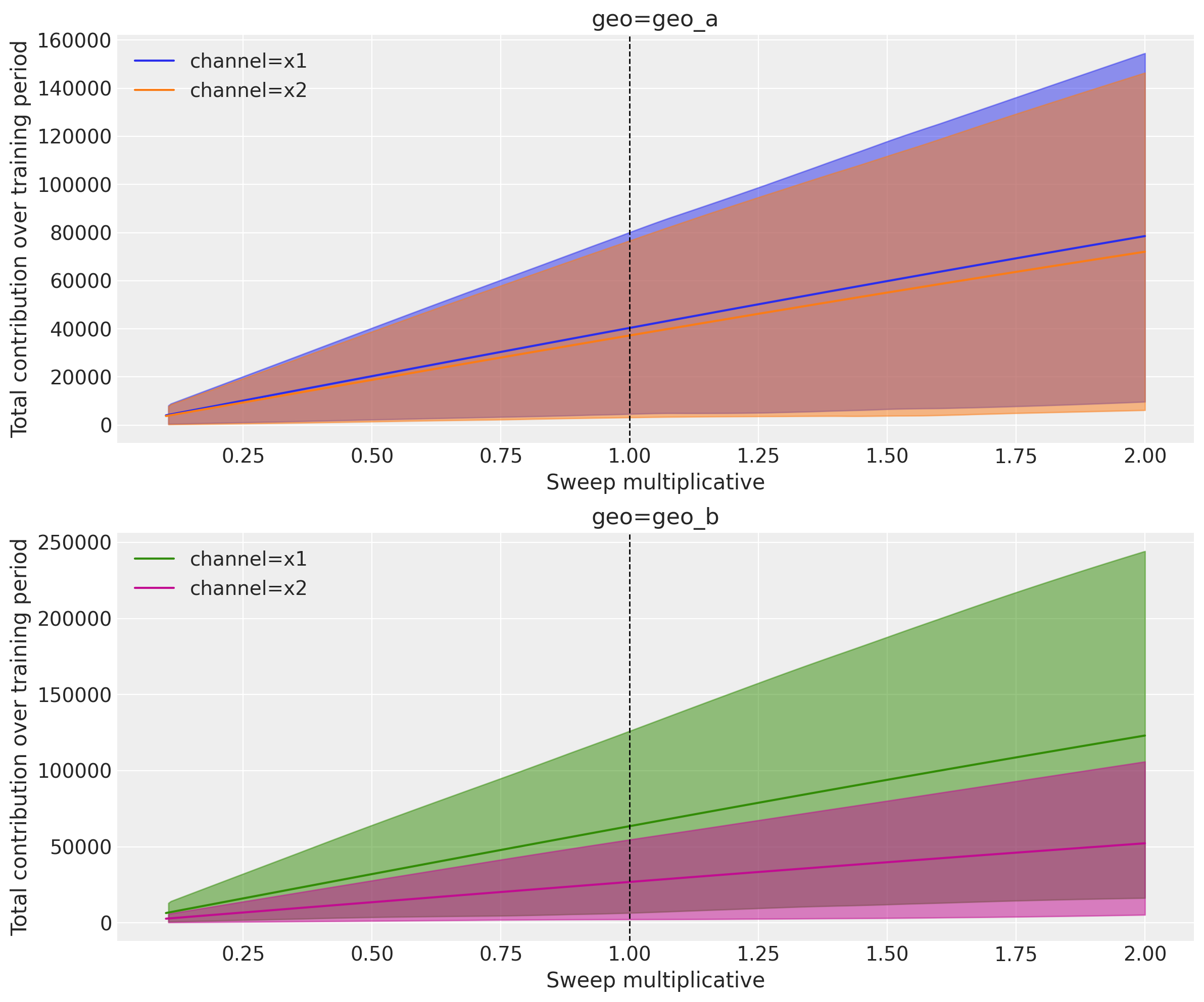 For Geo A, we see that the contribution of \(x_1\) and \(x_2\) are comparable whereas for Geo B, \(x_1\) has a much higher contribution than \(x_2\).