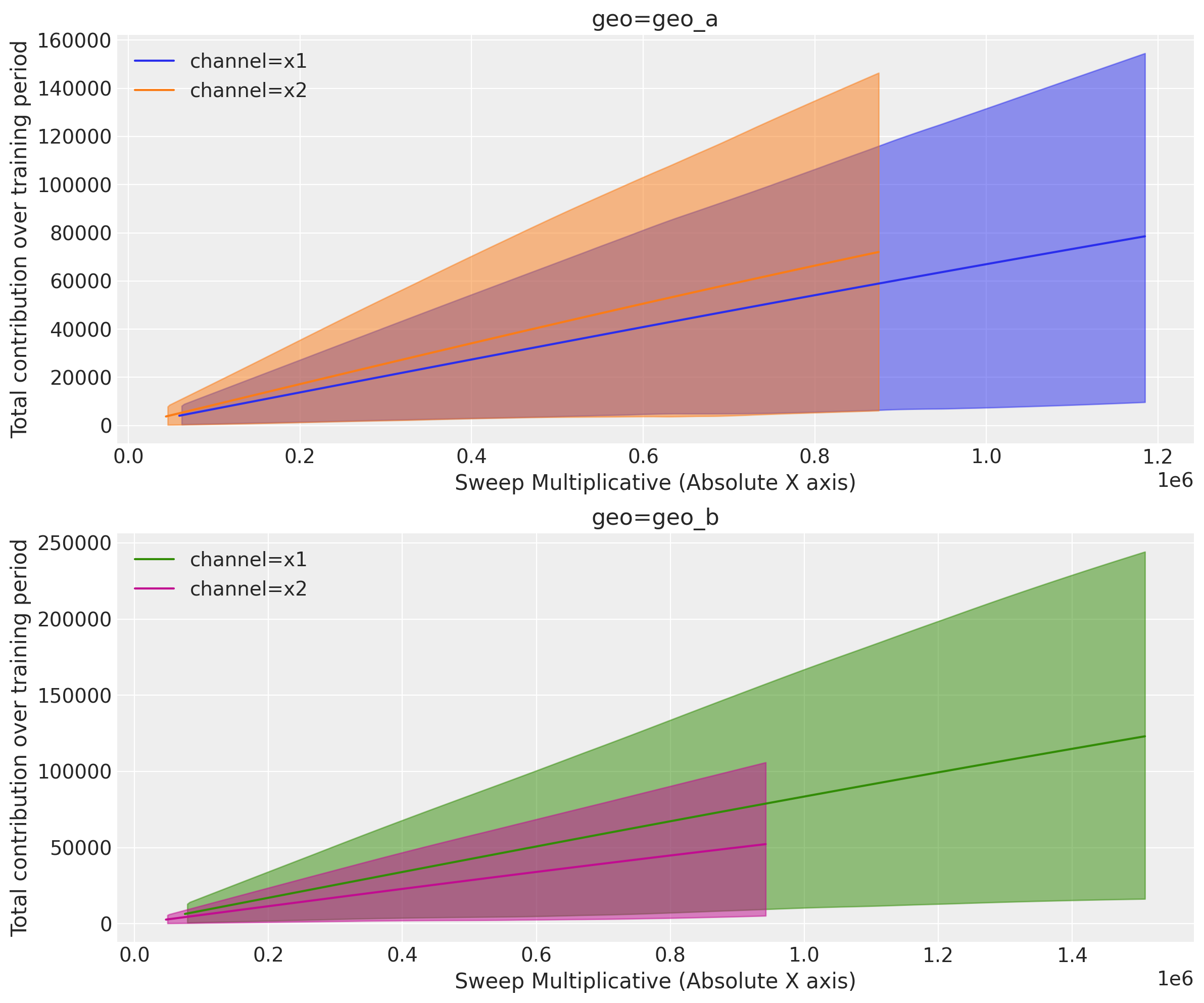 Instead of showing the sweep multiplier on the x-axis, you can display absolute spend values using x_sweep_axis="absolute". This multiplies the sweep values by the channel_scale for each channel, so each line shows its actual spend range.