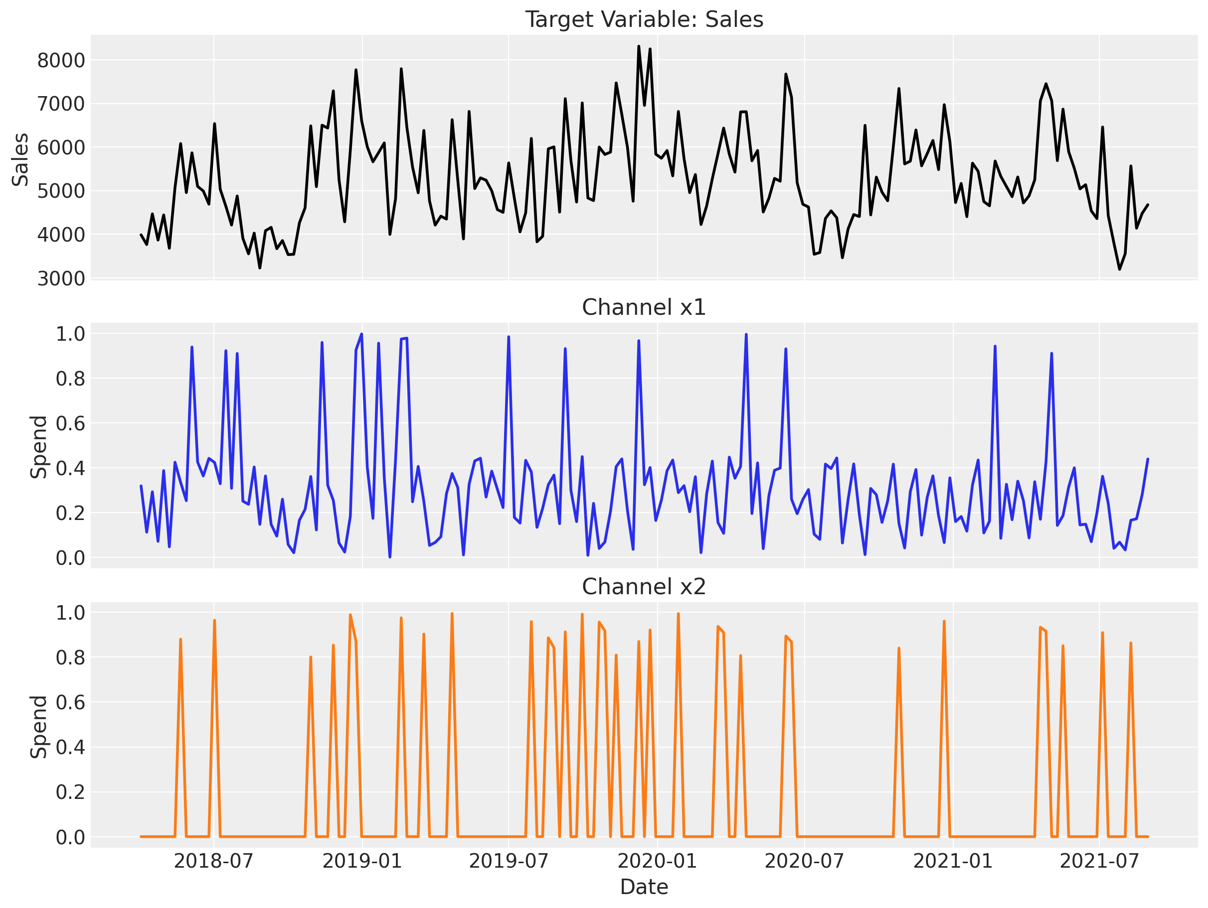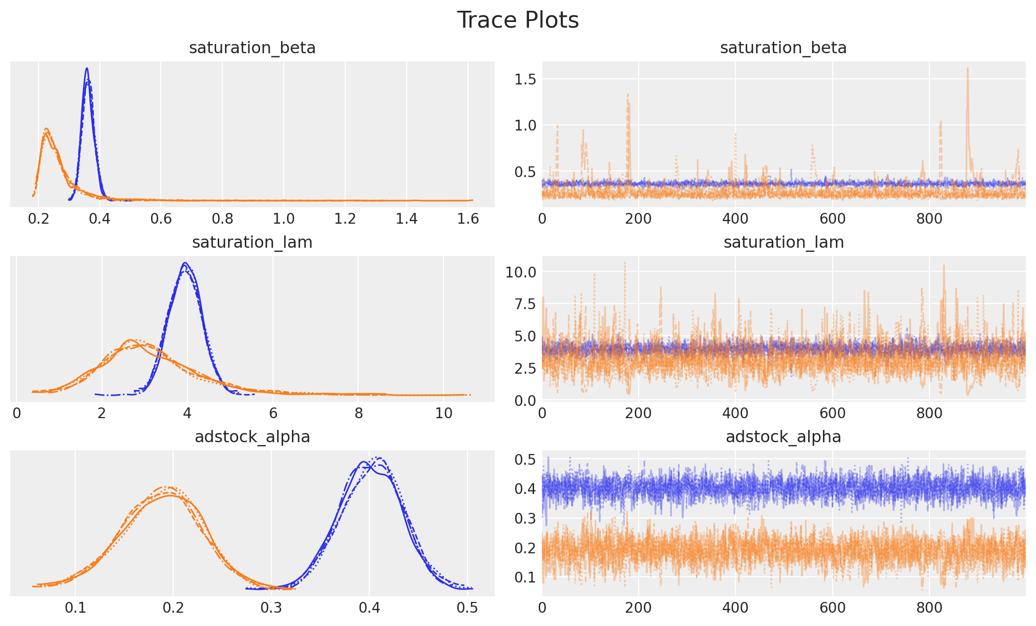 Let’s see how we can fit a basic MMM model to understand these effects and measure channel contributions.