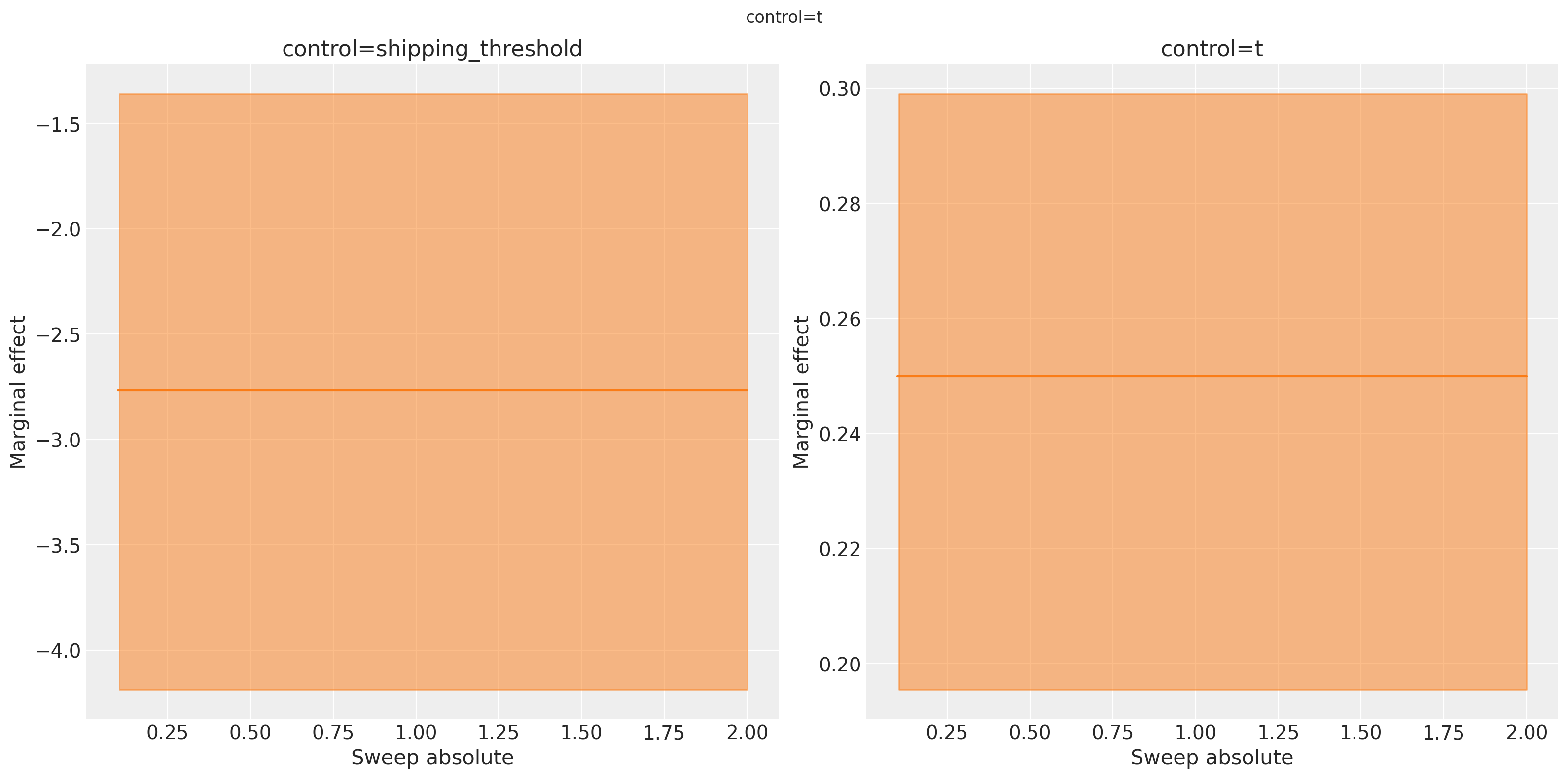 We can see the linear nature of the effects of the free shipping threshold on the outcome variable. The expected uplift is positive when we lower the threshold (people buy more when shipping is free), and the marginal effects are constant across the sweep values. This is because we assumed a linear relationship between the free shipping threshold and sales, so the marginal effect does not change as we adjust the threshold. The constant negative value is equal to the change in uplift as we increase the shipping threshold by $1.