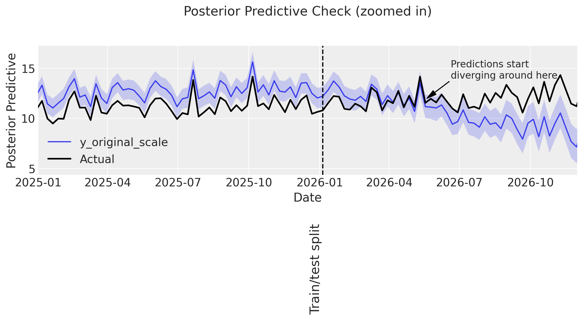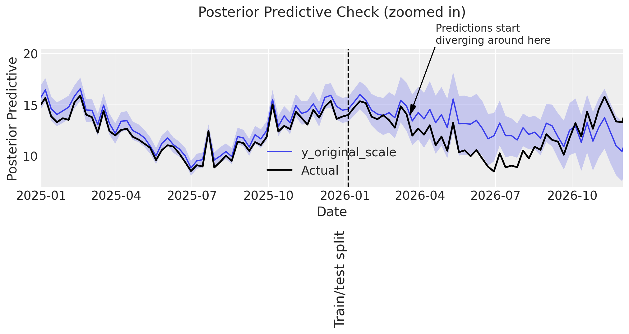 annotation_text="Hard to say exactly where\npredictions start to diverge\nmaybe here?",