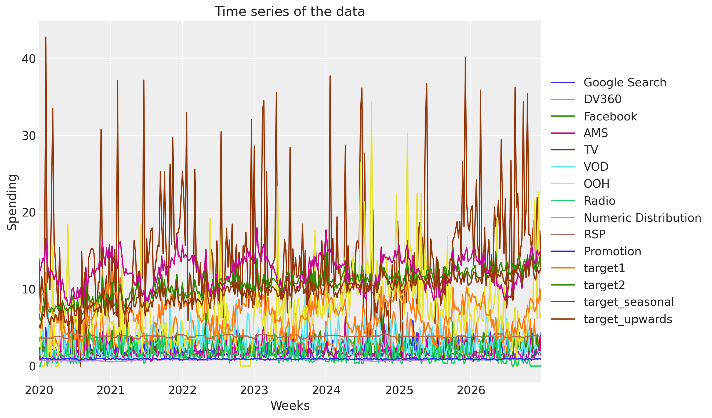 Weeks Google Search DV360 Facebook AMS TV VOD OOH Radio Numeric Distribution RSP Promotion target1 target2 target_seasonal target_upwards